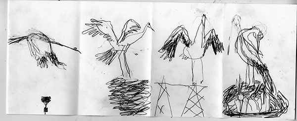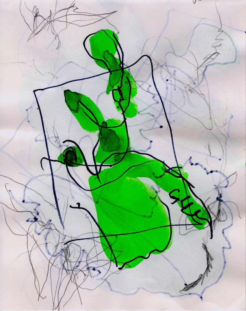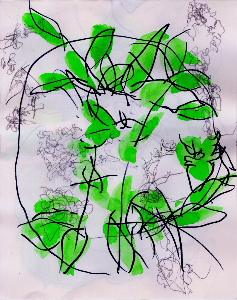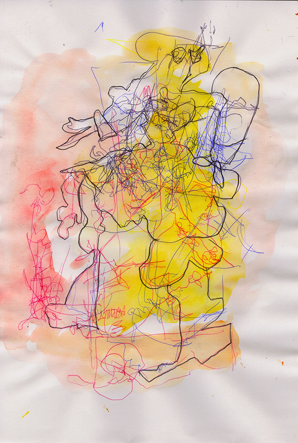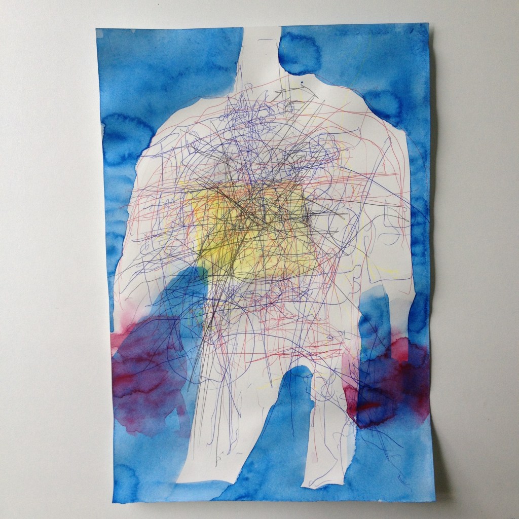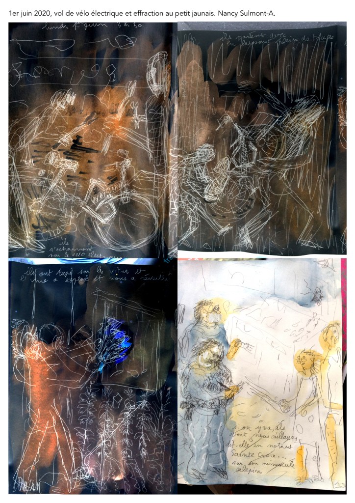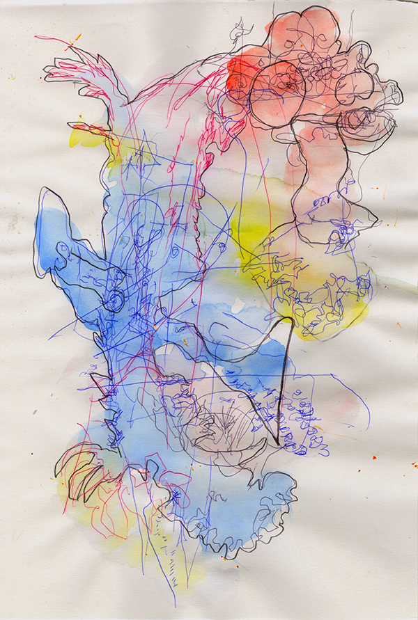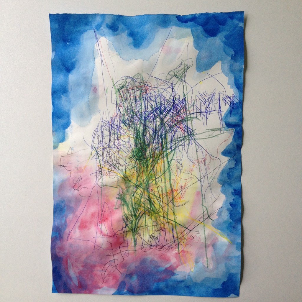 9 juin, revê : aquarelles sur dessins aux stylos bille fruits d’une ballade aux Sorinières avec Chrystelle Tropée.