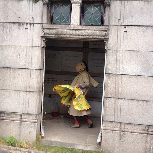 19 juin – Ambiance au cimetière de la Bouteillerie à Nantes avec Gaelle Le Guillou en photographe et cafetière soluble. Robe Gyro-vague et ses motifs de Revenants, dans le carré Z et le caveau des Roy.