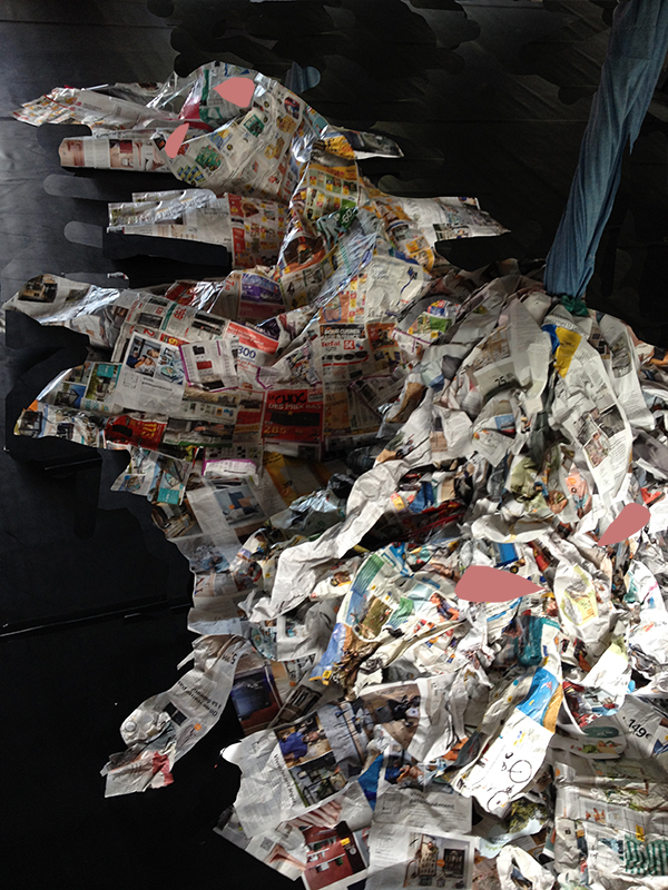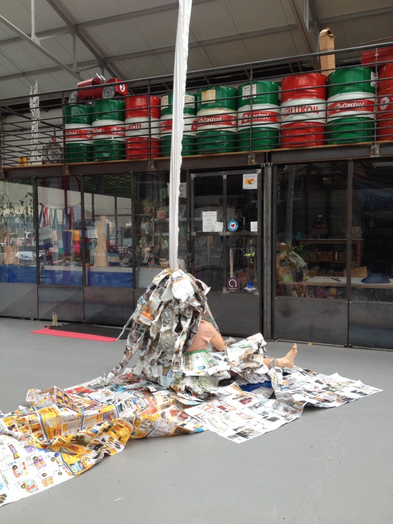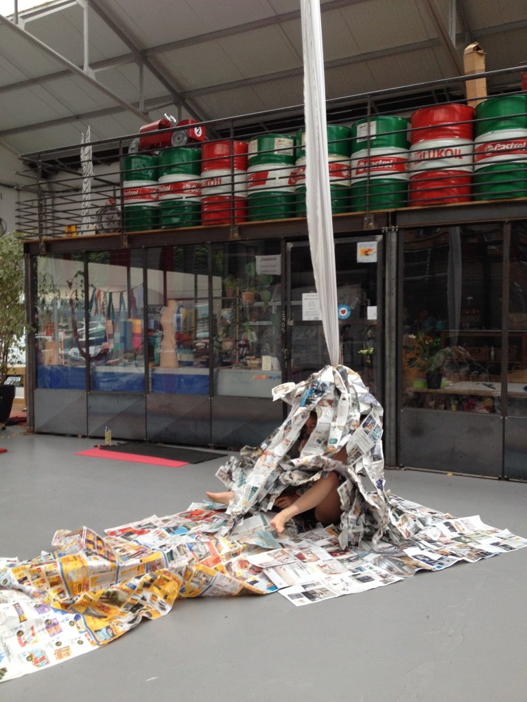 13-18 juillet. Mélanie a peur de l’échec et se retire. Je poursuis l’aventure au Quai des Chaps. « Papeureuse », ce titre un peu lapsus révélateur devient d’abord « Papereuse » puis « STATUTS ». J’invite Jean-François Assié pour travailler sur sa performance « le fruit, l’échelle » avec ses papiers imprimés « Contenu et débordement ». Nous travaillons ensemble puis l’un après l’autre, invitant nos amis aussi artistes (Ronan Cheviller, Chrystelle Tropée, Damien Hamon, Baptiste Brunello, Thierry Hoppe, Corinne, …) à assister à des répétitions et restitutions. Nous avançons à pas de géant. Pierre improvise au balafon son répertoire de musique africaine et m’ouvre des espaces, libère mon corps, le temps se dilue, les univers augmentent, se multiplient…