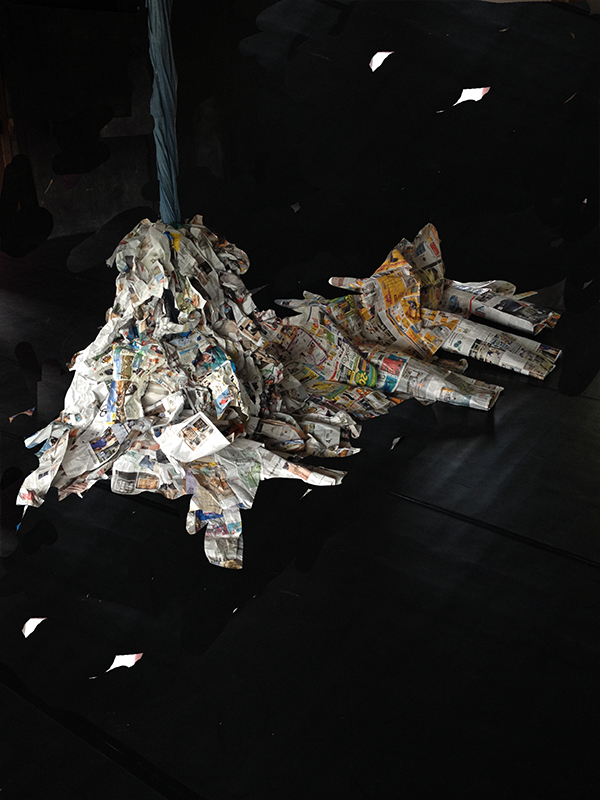 une forme faisant jouer corps, papiers, tissu dans un espace théâtrale