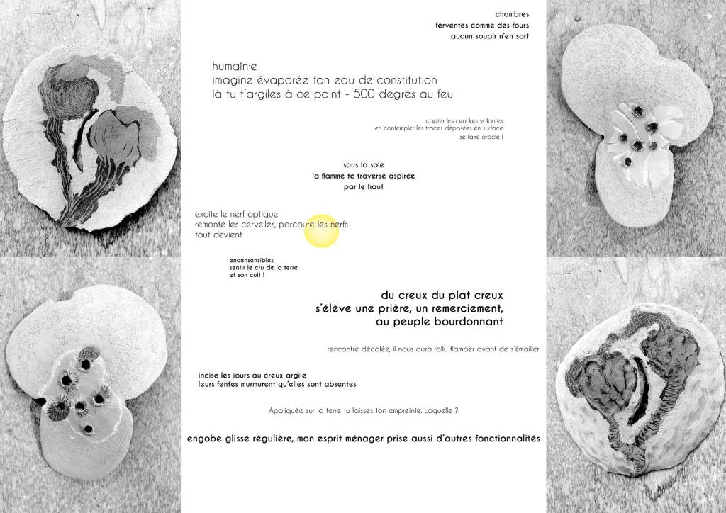 La suite de mes expériences en porcelaine et faïence… par le travail des terres de grès et à nouveau de faïence biscuitées avec Claire adepte de la poésie, de la lettre calligraphiée, modeleuse de terre. Edith Eyraud, céramiste nous rejoint pour partager nos savoirs-faire… Etienne son mari ingénieux nous accompagne sur la réalisation d’un four primitif et nous prête ses lessiveuses percées pour de beaux enfumages. Des noirs multicolores sur des terres mêlées (technique du nériage ou merikomi) partagés sur mon journal facebook accessible aux « ami.e.s ».