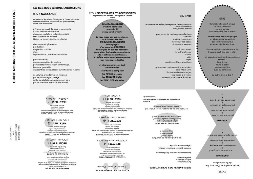 Sur une invitation du parcours EAC Ville de Nantes qui porte tout un catalogue d’interventions d’artistes dans les écoles maternelles et primaires de l’agglomération, et à la suite de « Une heure en Jabot Runcrab » mené en 2022/23, je propose en trois actes « Les trois RDVs du Runcrabouillons », une créature à faire naitre et grandir. Des expériences créatives étonnantes qui invitent les classes maternelles à dessiner et peindre autrement, vivre et faire vivre les papiers.