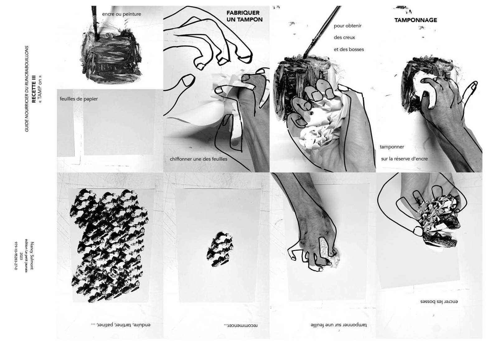 Le jabot Runcrab a été inventé par Nancy Sulmont en 2015. Cet outil, vêtement-chevalet, permet de pratiquer l’art ventral. En prenant appui sur la surface antérieure du corps pour peindre, dessiner, coller, frotter, gommer. Le regard peut se focaliser sur l’environnement stimulant les motifs du dessinateur. Qui oublie, dans sa gestuelle hasardeuse, le dessin apparaissant. On peut se servir des reliefs du corps ou les supprimer par l’usage d’un plastron rigide. Le corps entier est à l’œuvre dans ces jeux dessinés : le running crabouillage (crabouiller en courant), le walking crabouillage (en marchant), le staying crabouillage (immobile). 1 heure en chasuble Runcrab, pour faire naitre une créature. Présentation de Nancy dans la salle de classe