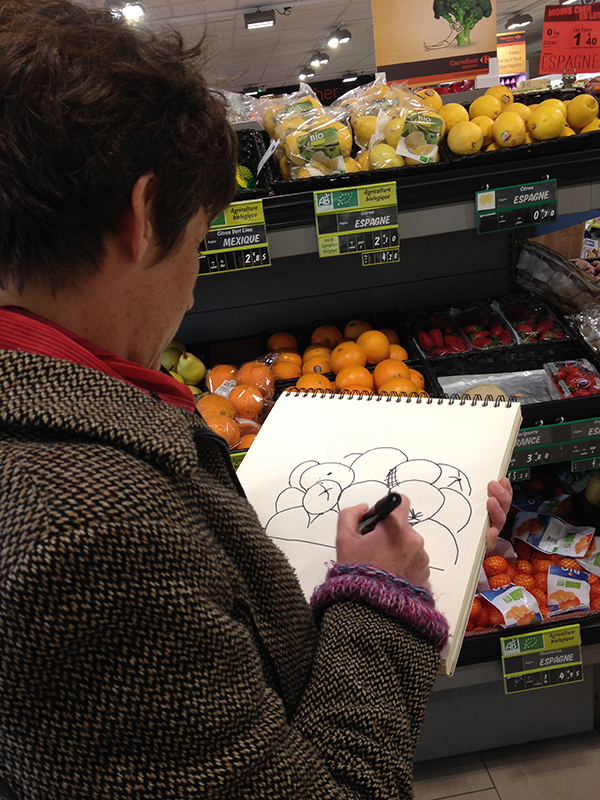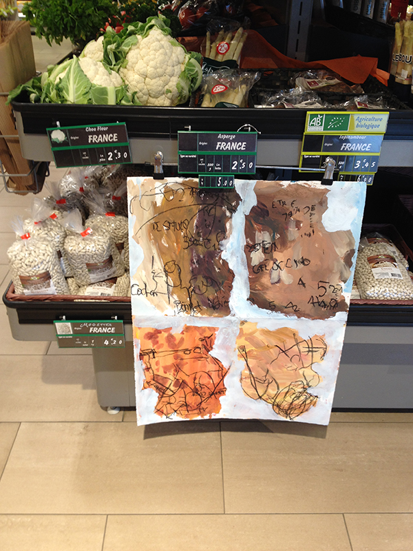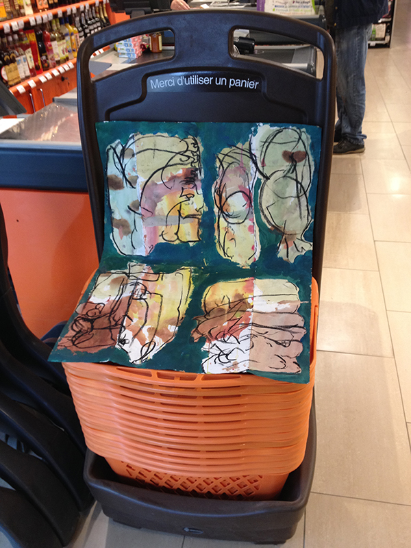 Au printemps 2019, nous entamons des suites de dessins et peintures entre les rayons de lait, fruits et légumes et surtout devant la plantureuse et fameuse vitrine d’Eric, le boucher de Chavagnes.