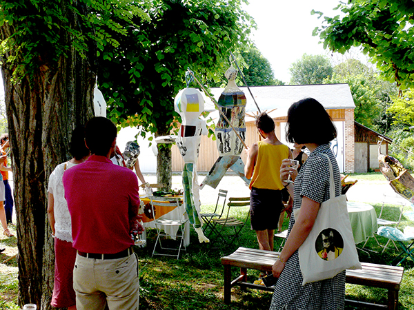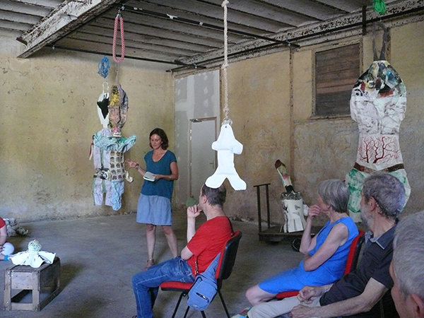 Suspendus à des perches, ils, elles les font déambuler frétillants autour du giratoire arboré de cette ancienne entreprise. Au milieu du public. Et finalement les grands corps souples sont accrochés aux hauts plafond du chais. Introduction à la présentation des différents travaux en cours des protagonistes de cette résidence : lectures, installation de textes, impro de musique, chorégraphie, peintures murales… (le petit bonhomme de César s’est glissé dans la fête)