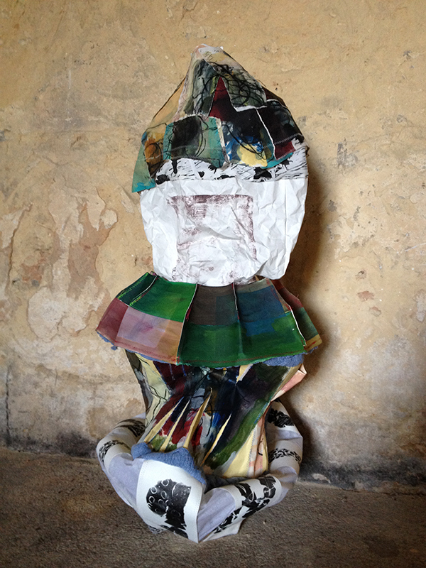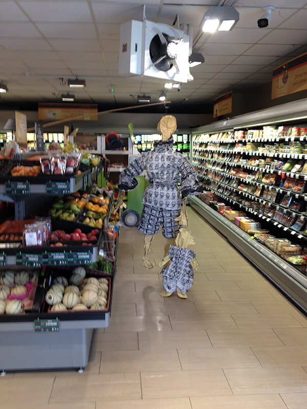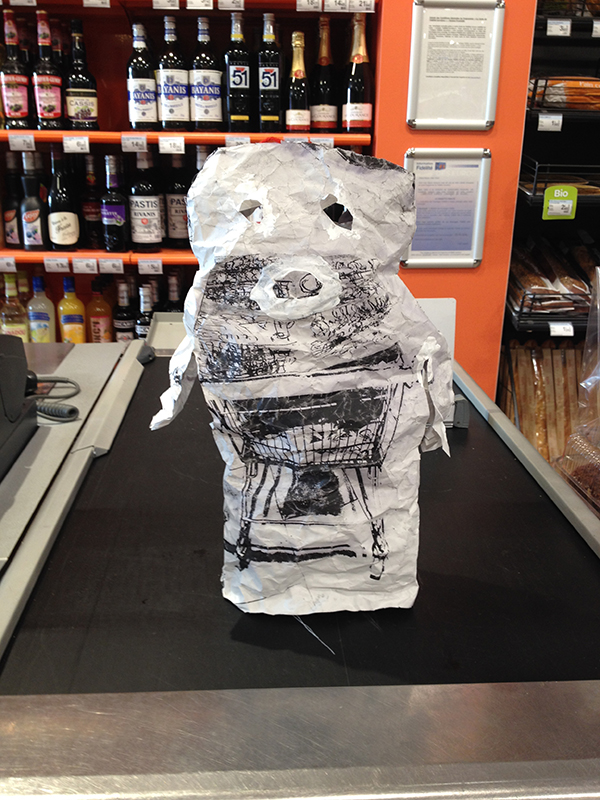 Dans notre atelier improvisé submergé ponctuellement par des effluves chaudes et odorantes qui s’invitent par la porte automatique, nous fabriquons quelques petites effigies de papiers cousus aux mêmes motifs. Un nouveau rayon Poupettes s’expose à la vente ; elles font quelques heureux.