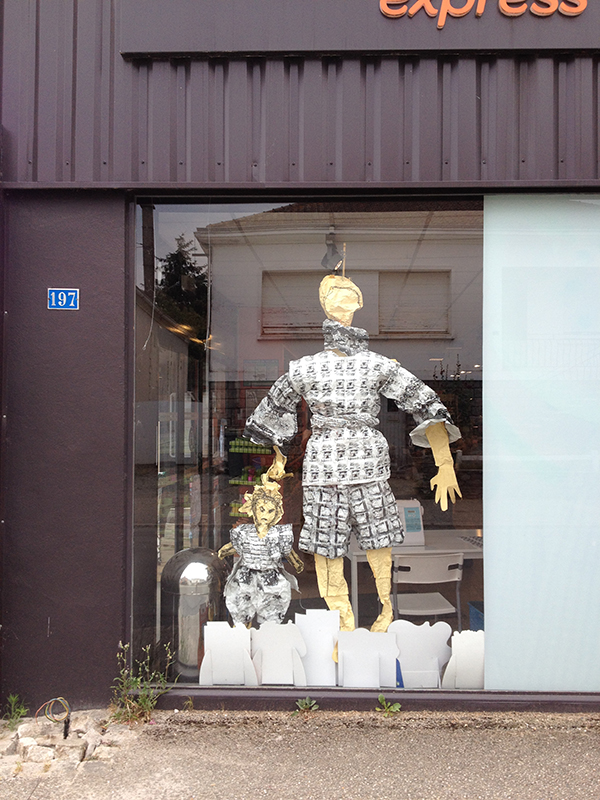 Premier WE de juillet 2019, nous amenons deux grandes sculptures de papiers CAROUFF & CRAFOUC . Le dessin de Caroline propose un client et son grincheux de fiston. Ils sont habillés de mes graphismes. Au bout de baguettes, ils vont accueillir sans discrétion et parfois accompagner quelques clients.
