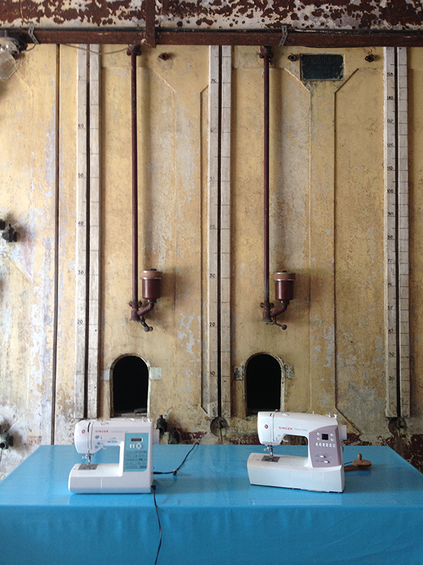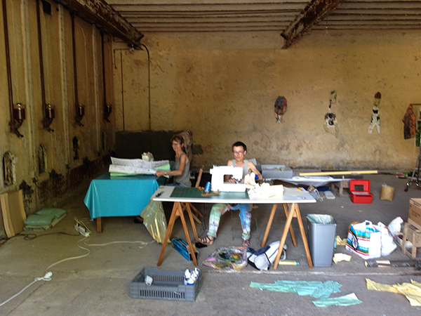 Nous mêlons nos archives de lithographies et de gravures, des dessins et peintures réalisés in situ, pour élever des volumes articulés par des soufflets en tissu, tricot, cousus de fils à la main et à la machine : six géants émergent petit à petit de ce foutoirs d’atelier improvisé.