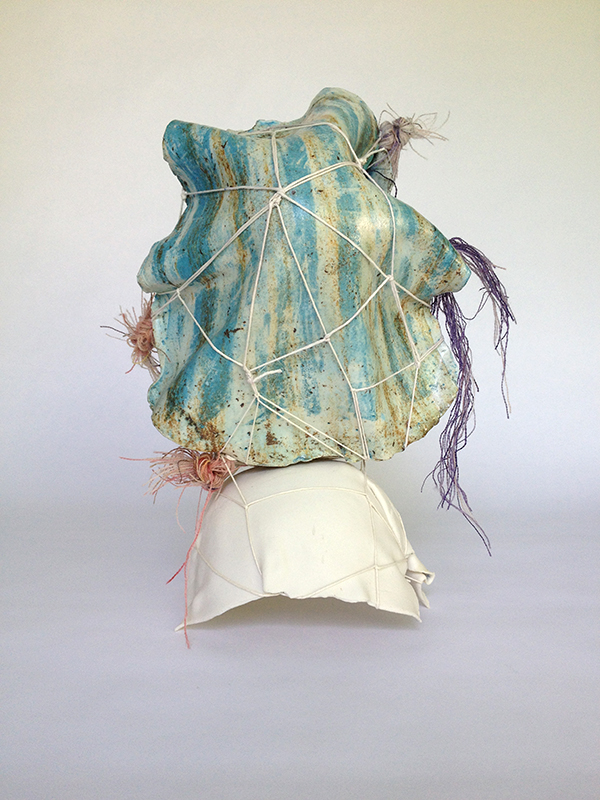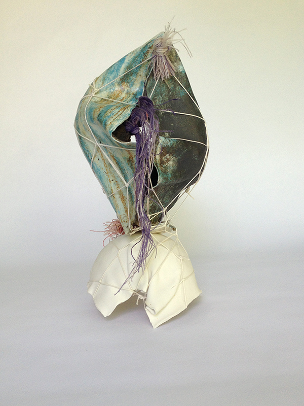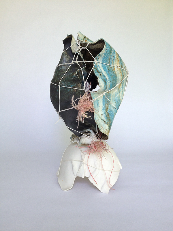sculpture en porcelaines lithographiées, liées par des fils de laine, coton.