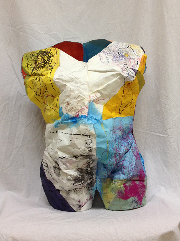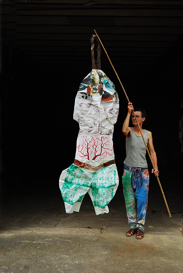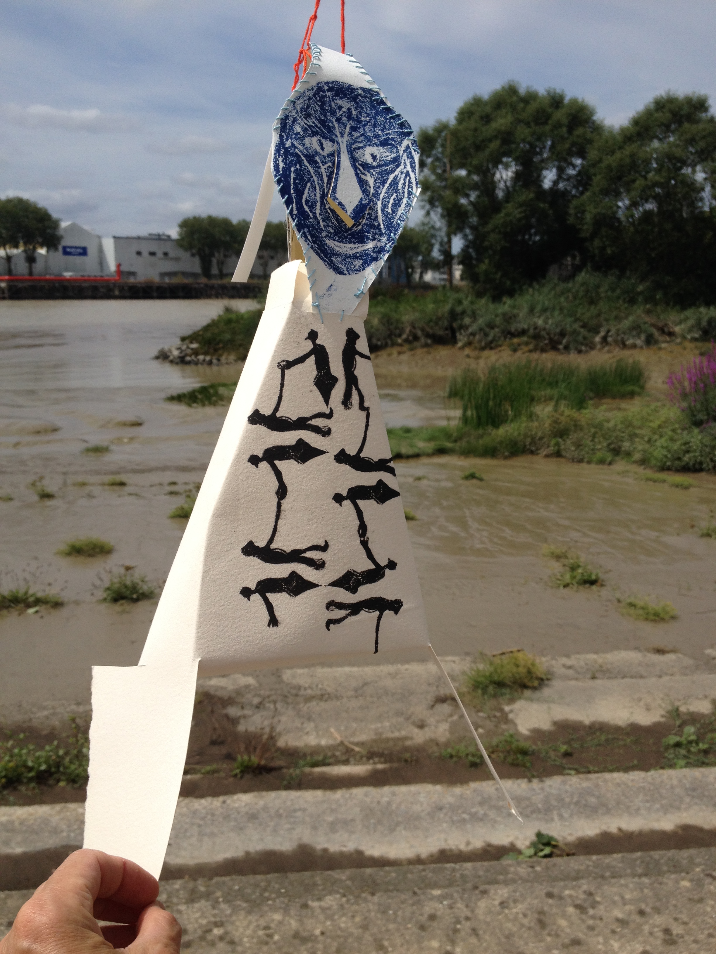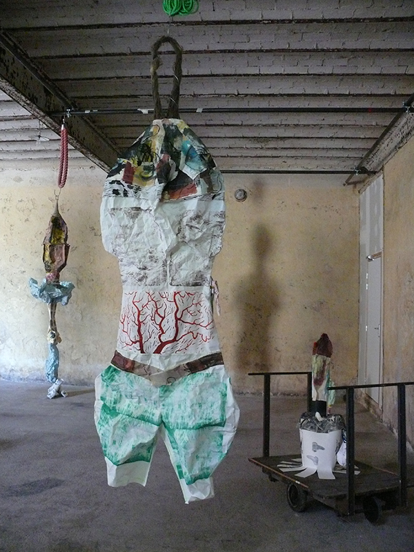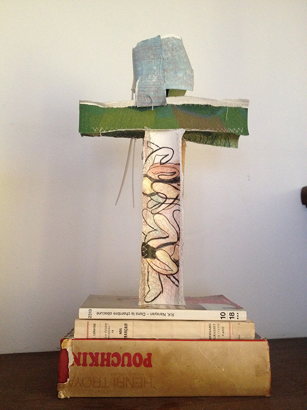 assemblage de mes (avec parfois quelques emprunts) dessins, lithographies, peintures, imprimés (revê), par la couture, le ficelage, le crochet pour créer des volumes à dimension variable.