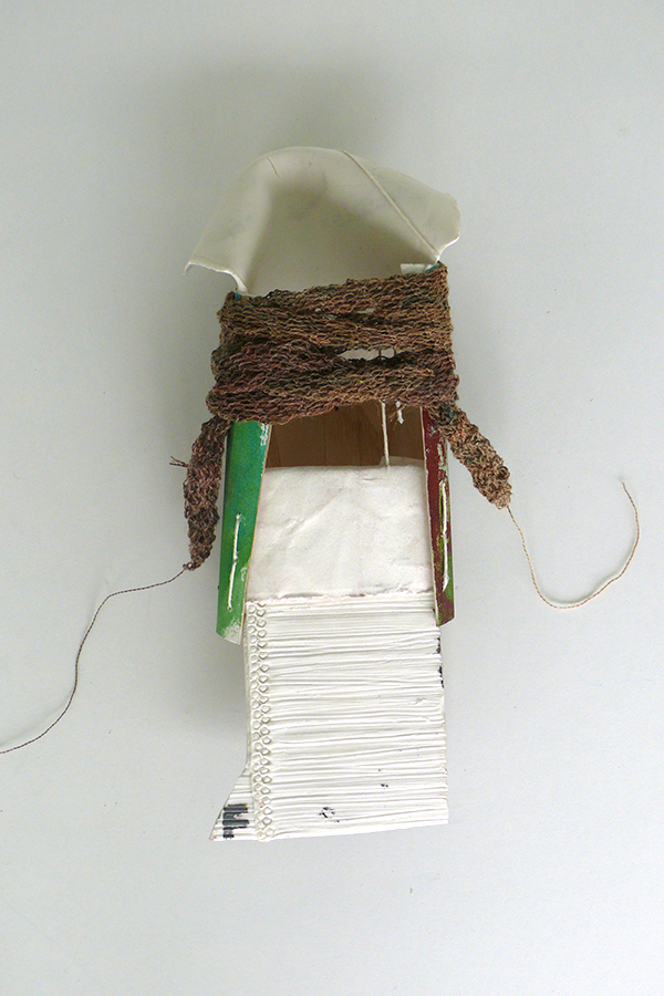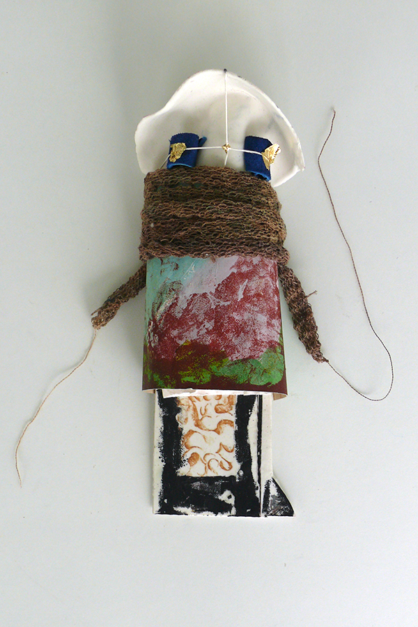 sculpture : papier et porcelaines lithographiés, laine, fil de lin, feuille d’or, cire, colle techniques mixtes, 30 x 11 x 10 cm