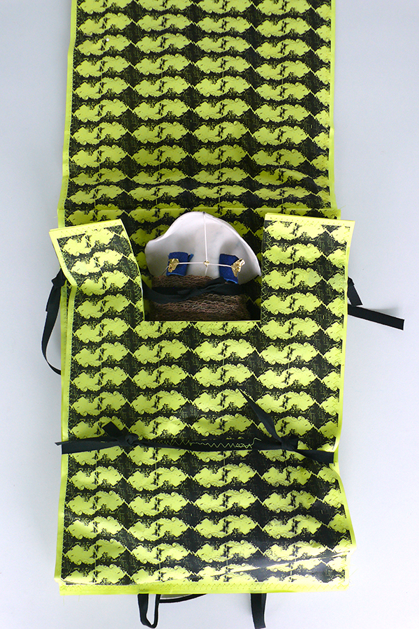 confinement : papiers à motifs photocopiés, intissé, fils de coton, ruban coton cousus, collés, 40 x 30 x 10 cm